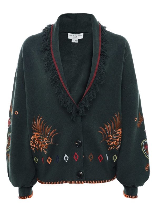 The Fringed Safari Cardigan by Never Fully Dressed is a relaxed knit cardigan with a shawl collar finished in a feathered fringe and a three-button front fastening. Intricate embroidery decorates the front and sleeves, while contrast whipstitching embellishes the ribbed hem and cuffs for an artisanal finish. Shaped with a dropped shoulder and roomy sleeves, the piece offers easy layering over shirts and knits.