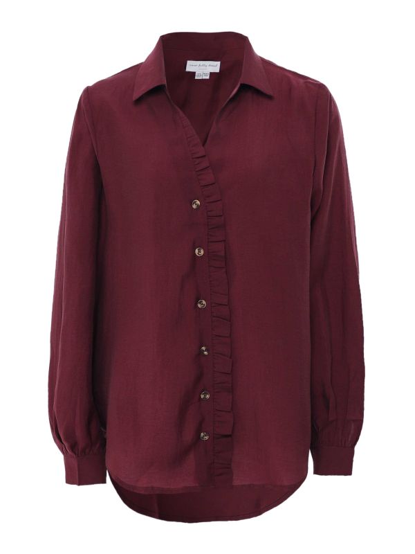 The Never Fully Dressed Miley Ruffle Shirt is a relaxed button-through shirt with a frilled placket and classic collar. Subtle gathers at the back yoke create gentle movement while the long blouson sleeves fasten with buttoned cuffs. The shirt finishes with a curved hem that dips lower at the back for easy layering. Wear tucked into skirts or with tailored trousers for a refined daytime look. The design features a visible embroidered motif on the back yoke and tonal tortoiseshell-effect buttons.
