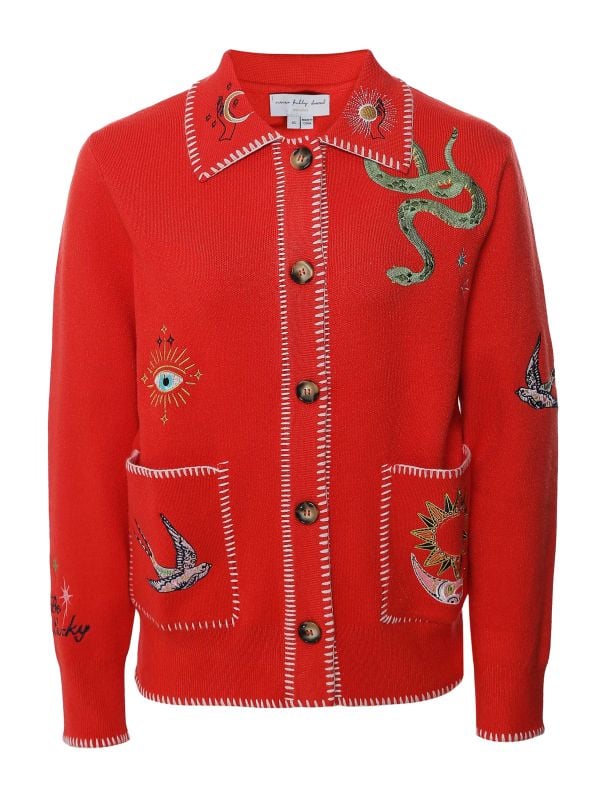 The Mystical Collar Cardigan by Never Fully Dressed is a button-front knitted cardigan finished with a pointed collar and bold contrast whipstitch trim. Two patch pockets and shell-effect buttons frame a series of embroidered motifs, from suns and moons to snakes, birds and an all-seeing eye, that add playful, graphic interest. Ribbed hems and cuffs give structure while the relaxed silhouette works well layered over shirts, skirts or trousers. Fasten for a neat fit or wear open to showcase the collar and decorative embroidery.