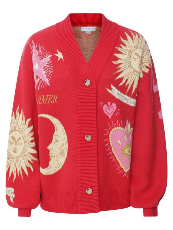 The Mystical Cardigan from Never Fully Dressed features bold, mystical-inspired graphics woven into a soft knit. Standout embroidered suns, moons and stars add visual interest front and back, while ribbed trims and a button-up fastening provide structure. The relaxed fit and dropped shoulders make it easy to layer over shirts or tops for a playful day look. Impressive attention to detail is demonstrated in the variety of motifs and tactile mixed-texture placements.