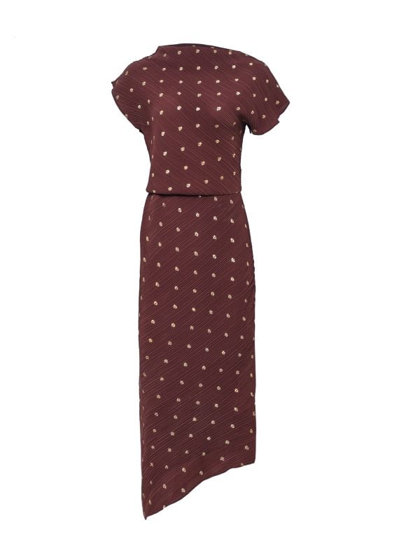 Discover the Plissé Desiree Midi Dress by Never Fully Dressed. Cut in a sculpting plissé fabric, the dress is detailed with scattered metallic spots, a high crew neckline and short cap sleeves. A defined waist seam refines the silhouette while an asymmetric midi hem introduces movement and modern lines. Style with pointed heels for evening or sleek boots and a coat for daytime transitions. Finished to sit close to the body while allowing movement, it moves easily between day and evening plans.