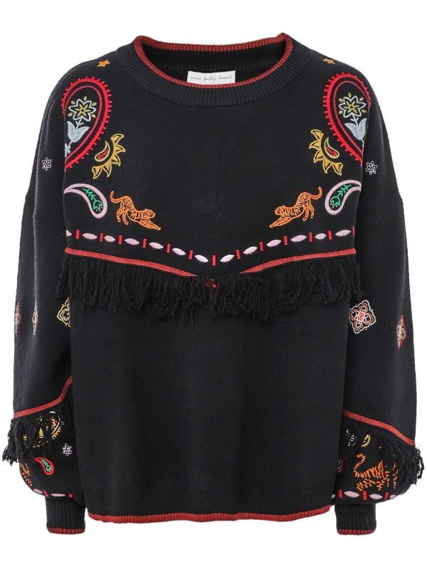 The Never Fully Dressed Safari Jamie Fringed Jumper is a relaxed knitted jumper detailed with embroidered motifs and a fringed yoke for textured interest. It features a ribbed crew neckline, long sleeves with fringed trims and ribbed cuffs and hem for shape retention. Lightweight yet structured, the piece works equally well tucked into skirts or worn over shorts. Finished with decorative embroidery across the yoke and sleeves.