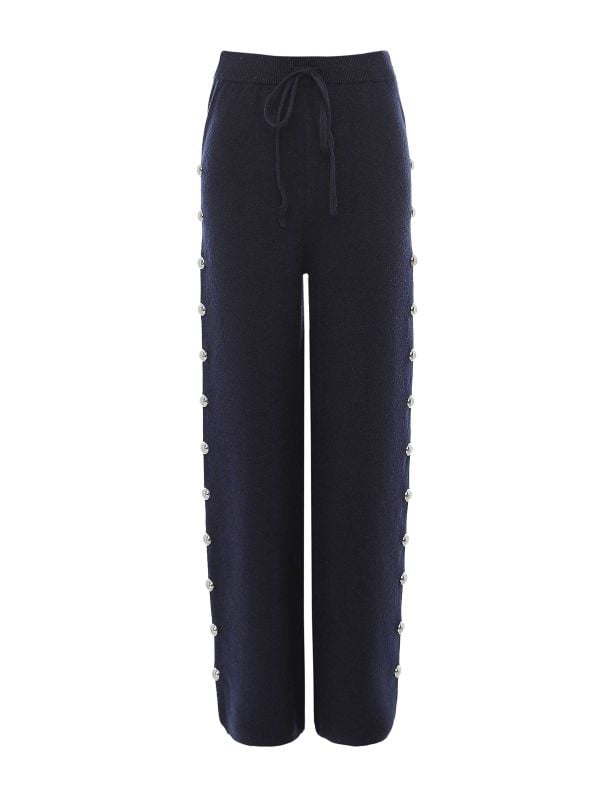 The Studded Knit Joggers are a relaxed, wide-leg style with a ribbed drawstring waist and metal stud trims running down each side. Designed by Never Fully Dressed, they have a pull-on construction for easy wear and a long, flowing leg that pairs well with Sneakers or Booties. The studs give a sporty, decorative finish while the knit construction offers softness and movement. The elasticated waistband ensures comfort throughout the day, making them easy to style for travel or weekend plans.