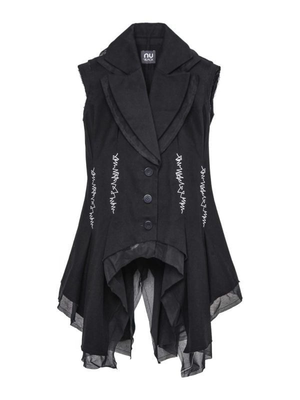 Unlock your creative side in the NU London embroidered fitted waistcoat. This experimental waistcoat design combines traditional tailoring, including the fitted waist and button fastening, with a double collar, shoulder pads, frayed sleeves and a high-low hem that creates a layering effect.