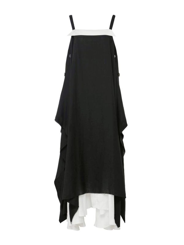 The Layered Strap Dress is a long statement dress from NU London. Crafted from hemp fabric, the dress has a soft feel and is lightweight for a cool and comfortable wear in the warm season. The dress is a long length with wide straps, a contrasting white neckline, large buttons to the sides and a layered skirt which reveals the floaty white lining. Delivering an elongated silhouette, this dress is a particularly elegant piece for any occasion.