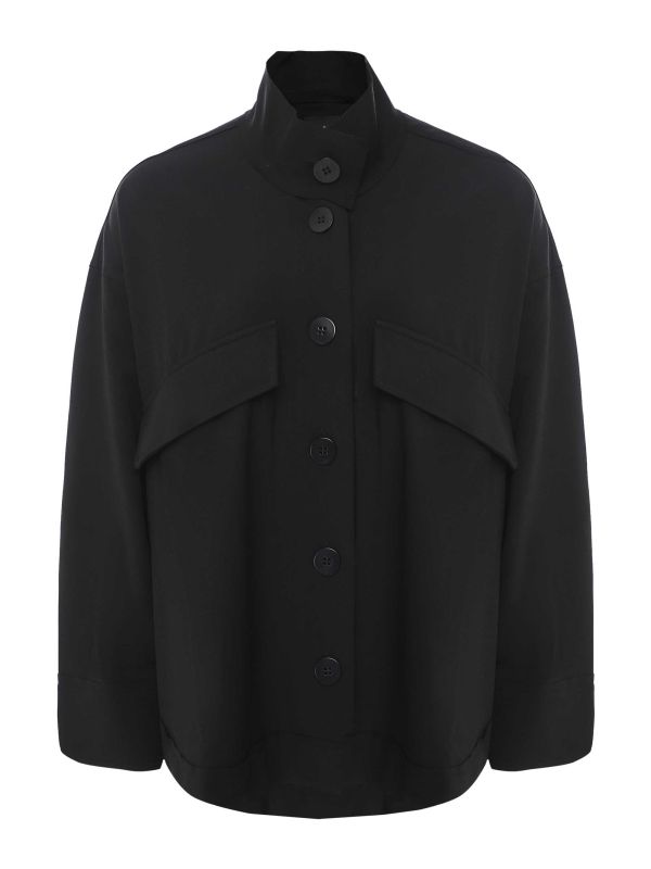 The NU London Oversized Jacket is a lightweight, shacket-style jacket. Made from a soft and smooth fabric, this NU London jacket features a high collar and large buttons for closure. It has long sleeves with buttons at the cuffs, a rounded hem cut shorter at the front and two slanted flap pockets on the chest. The left arm also has a single flap pocket.