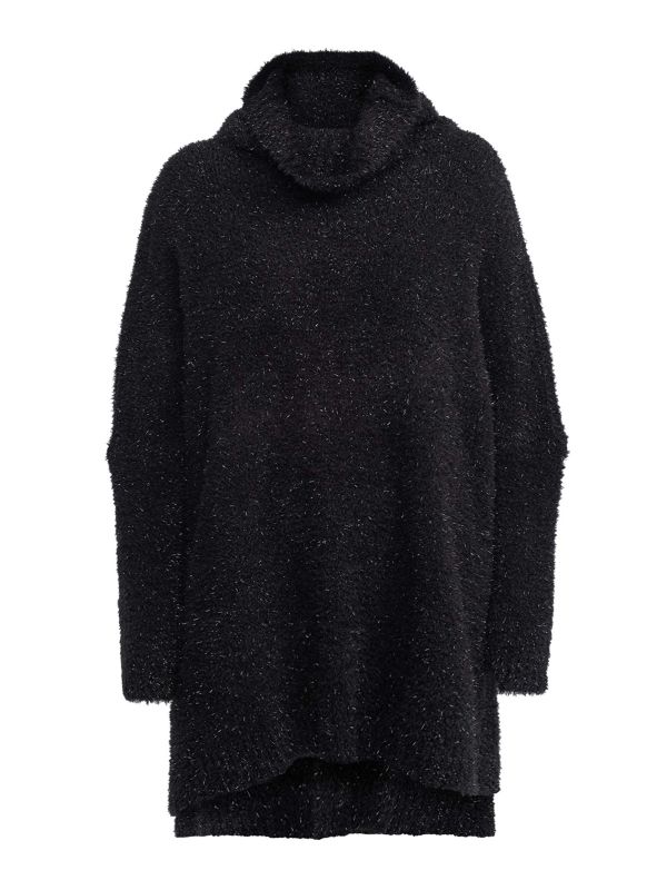 Slip into the oversized shiny sweater by NU London for elegance and comfort. Cut with a high-low hem, the back of this sweater reaches behind the knee for a roomy, cloak-like fit with extra-long sleeves and a loose-fitting turtleneck. The shiny yarn details add sparkle and shine to brighten your look.