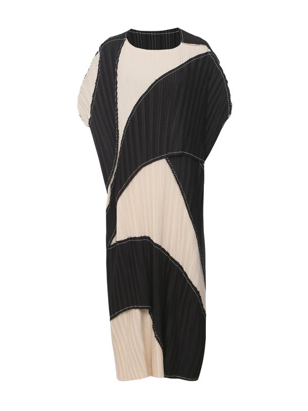 Explore super contemporary design with the NU London pleated dress. Uniquely constructed with a contrast piece block design, the midi dress has been given a pleated texture for a soft and tactile handle. Featuring an elegant round neckline and sleeveless fit, whilst the raw edges provide stylish detail.