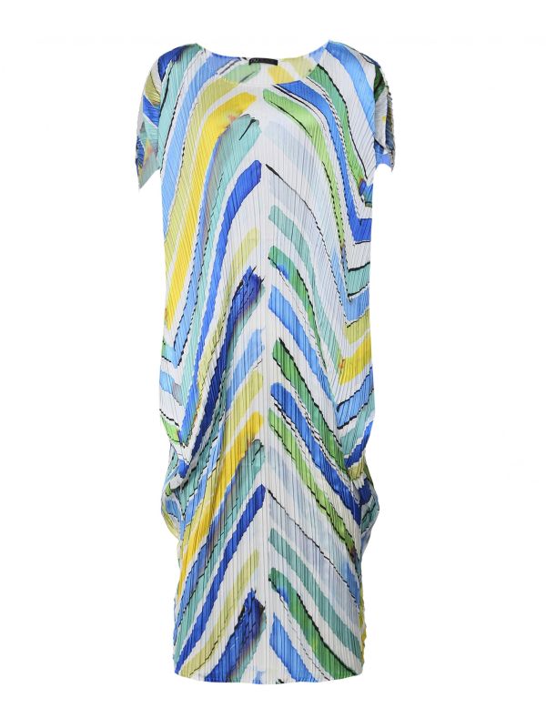 Get a vibrant look this season with the NU pleated chevron dress. This bold midi dress is crafted in a pleated fabric with a sleeveless design, draped shoulders and inseam side pockets. Perfect for laid-back summer days, this beautiful dress is cut for an oversized fit and is complete with a chevron paint print for a unique finish.