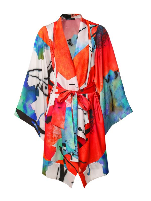 The NU London kimono is a beautiful statement piece with a bold, abstract print. Crafted in lightweight polyester, this comfortable robe can be dressed up or down for a variety of different occasions. It features a flattering V-neck, self-tie waist belt, long sleeves and a draped front.
