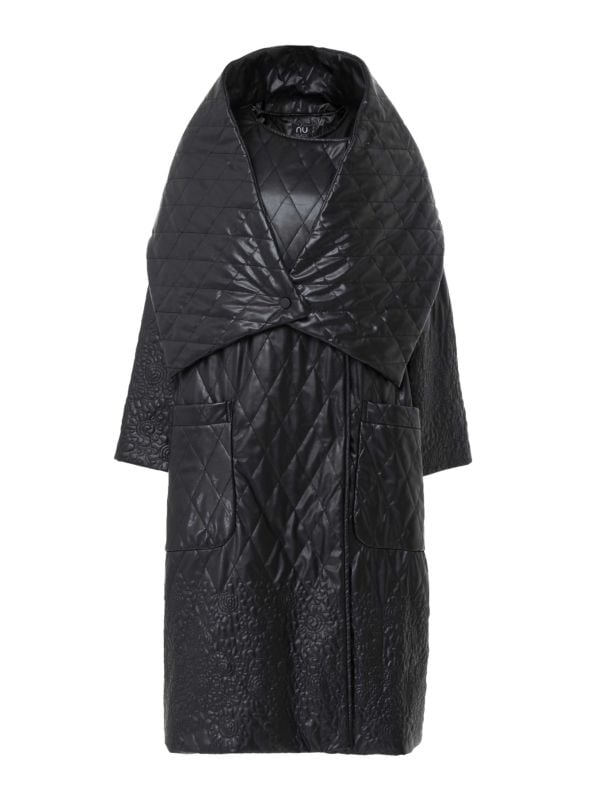 The NU London quilted wrap collar coat offers modernity for your coat collection. This coat is beautifully crafted from vegan leather and features an all-over quilted pattern, matching detachable collar that wraps around like a shawl, snap back button closures, two roomy front pockets and embroidery detailing on the sleeves and hem.