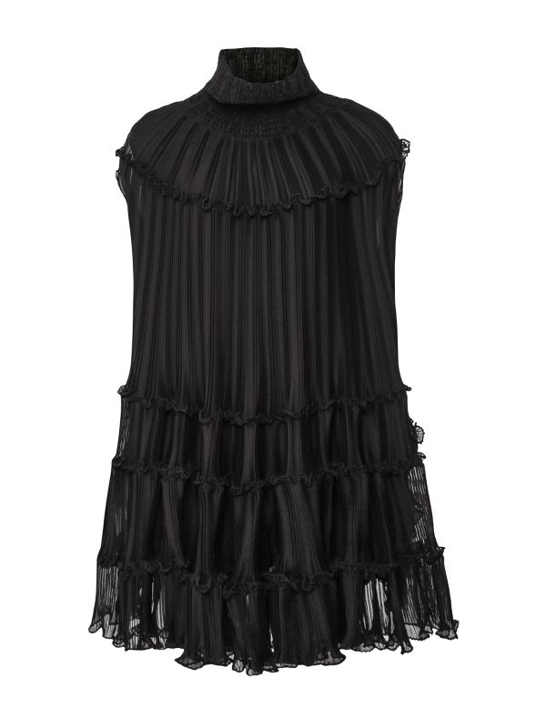 Turn heads with the NU London smock dress, which looks great styled with chunky sandals or layered over pants for a dose of contemporary style. This beautiful, sheer dress boasts a distinctive design with its ribbed stand collar and sleeveless silhouette. A tiered skirt and gorgeous smocked detailing complete the look.