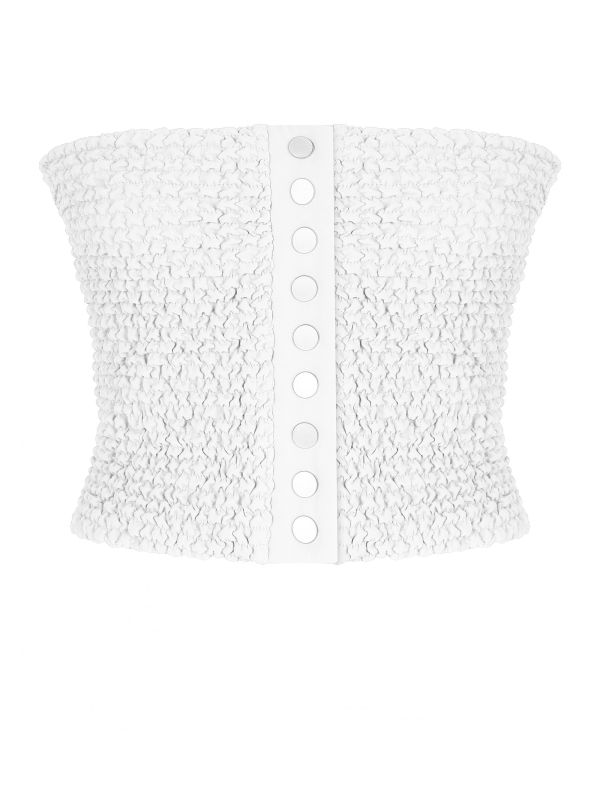 The NU bandeau top is a stylish summer piece to wear with casual pants and skirts. Boasting a strapless cropped silhouette, this simple top features a snap button fastening down the front and smocking throughout for a textured finish.