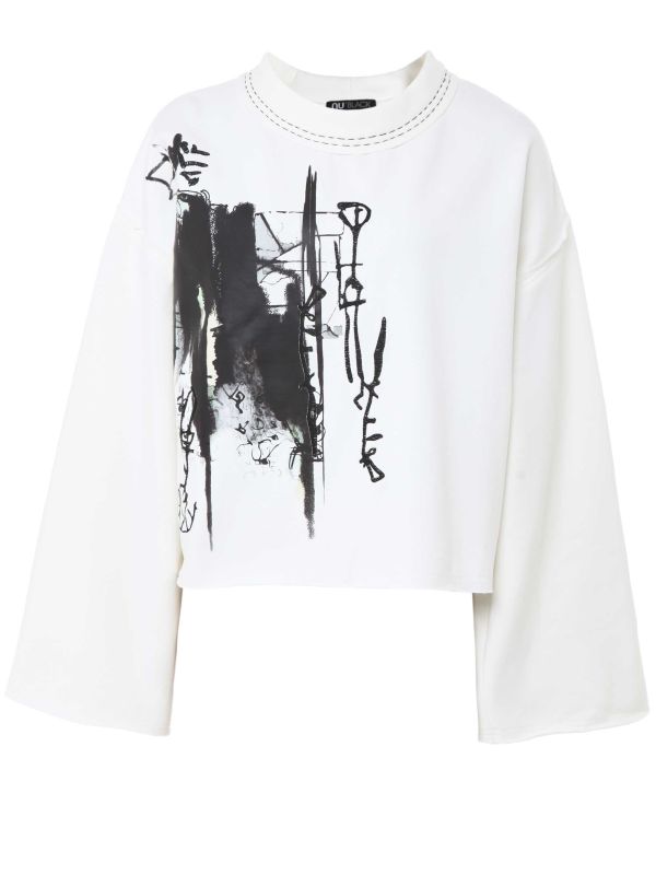 Elevate your leisurewear collection with the NU London swiggle print sweatshirt. Made from 100% cotton for extra comfort, this sweatshirt has a cropped fit with long kimono sleeves, a round collar with contrast black stitching and a black abstract print on the right side. Wear it over a turtleneck for additional layering.