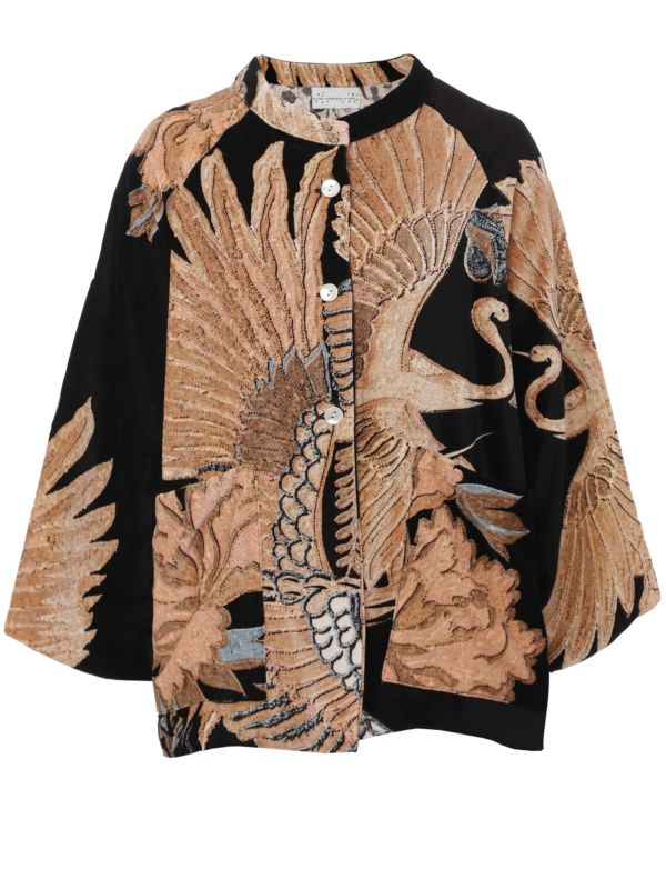 The Crane Black Velvet Jacket from One Hundred Stars is a velvet kimono-style jacket with a relaxed, boxy silhouette. It features a stand collar and a central button fastening with visible round buttons, plus two patch pockets at the front for practicality. Long raglan sleeves create a fluid, draped line while the all-over patterned design adds visual depth. Layer over tailored trousers or a slim dress for considered evening or daytime looks, offering a tactile outer layer that elevates simple separates.
