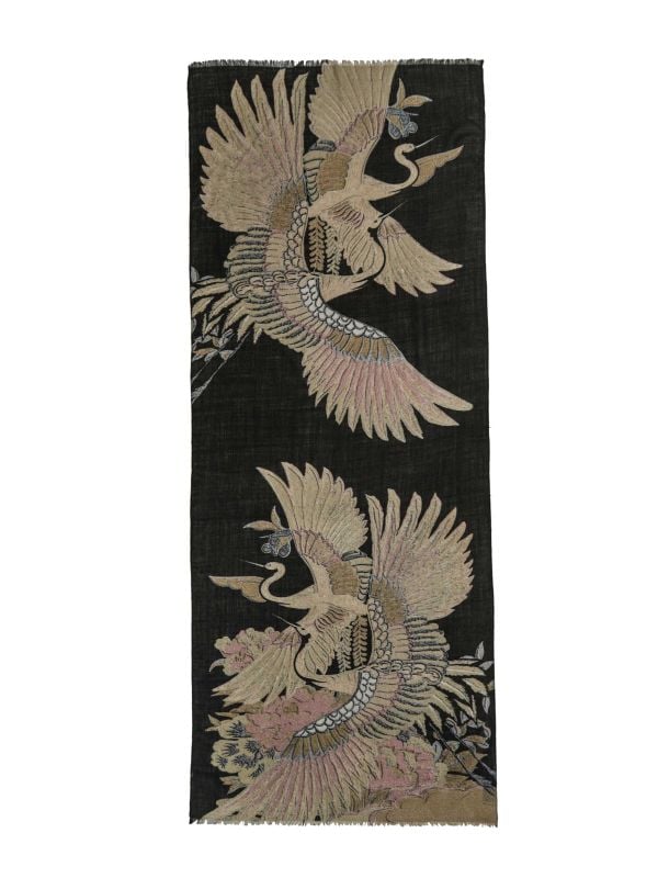 The One Hundred Stars Crane Black Wool Scarf is a long, woven accessory that brings artisan-inspired detail to outerwear. Printed with a dramatic crane motif across its length, the scarf has a soft handle and fringed hems for a casually finished look. Lightweight yet warming, it layers easily over coats and knitwear for added texture and interest. The rectangular shape offers versatile styling; drape, knot or wrap to suit your outfit.