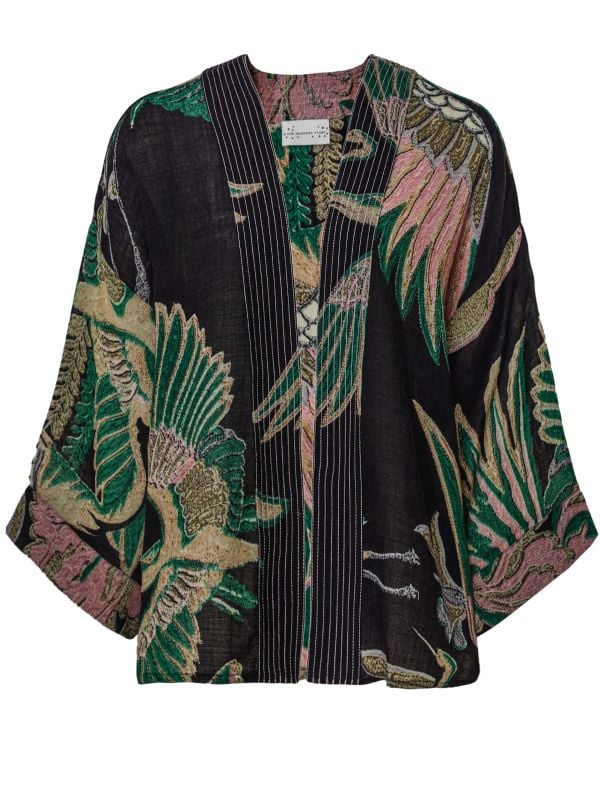 The Crane Emerald Wool Kimono from One Hundred Stars is a relaxed, open-front layer with a generous silhouette. It features a contrasting stitched front band and wide 3/4-length sleeves, finished with turned cuffs for added structure. A bold botanical print covers the piece, giving it expressive texture and movement. Wear it over simple separates to add pattern and ease to an outfit, or use it as a light outer layer for transitional days. The piece balances comfort with distinctive detailing.