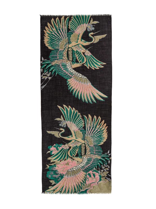 One Hundred Stars' Crane Emerald Wool Scarf is a long wool scarf featuring an embroidered crane motif. Printed base with detailed embroidery creates texture, while fringed ends provide a tactile finish. Its rectangular proportions make it simple to wrap or drape over outer layers, adding pattern and movement to outfits. Wear it as a traditional scarf, a shawl or a lightweight wrap to vary proportions. The detailed motifs reference natural forms and heritage printmaking, offering a decorative accent that complements both coats and knitwear.
