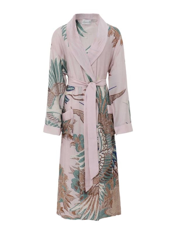 Designed in one size to flatter a range of shapes, the One Hundred Stars gown features elegant shawl lapels, a self-tie waist belt for adjustable styling, and practical patch pockets. The soft long sleeves add comfort, while the graceful crane print brings a touch of Eastern-inspired charm to your everyday lounging or layering.