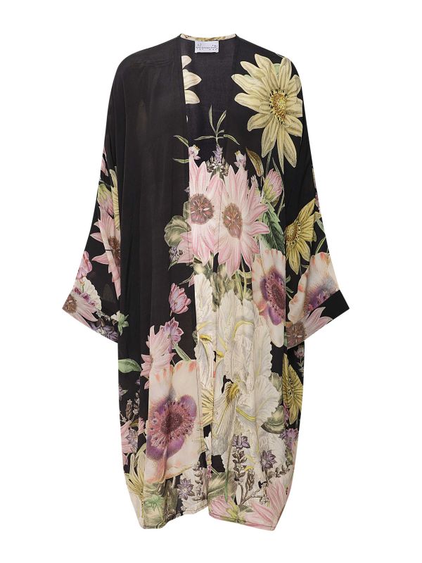 Introducing the Daisy Black Grande Kimono from One Hundred Stars for the new season. This kimono stands out with its scattered print of pastel-hued English flowers, including daisies and irises. Cut for a loose fit, it features an open front and loose wide sleeves as well as hidden pockets to the sides. Style it with jeans and a camisole for an everyday spring/summer look.