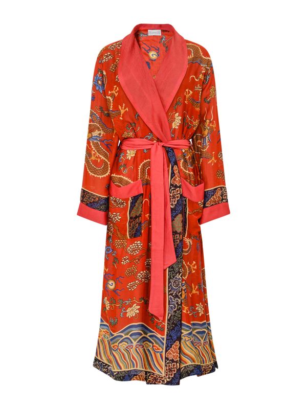 The One Hundred Stars dragon rust gown is a stunning piece that beautifully marries comfort and style, making it a must-have for any wardrobe. Crafted from a luxurious cupro and viscose blend, this gown drapes effortlessly, creating a flattering silhouette. The folded shawl collar adds a touch of elegance, while the self-tie waist belt allows you to define your shape with ease.