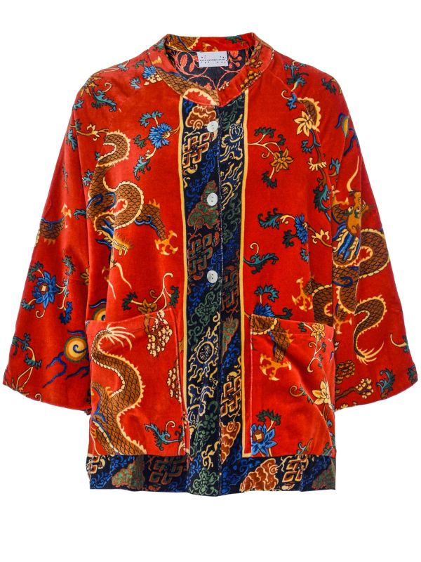 Make a statement in the One Hundred Stars Dragon Rust velvet jacket, a vibrant design featuring a beautifully rich dragon print. Crafted from 100% cotton velvet, this One Hundred Stars jacket has a round neckline and closes with a button fastening at the front. It has a wide sleeve and large front pockets, perfect for carrying your everyday essentials. Wear it open or closed with everything from denim to floaty skirts.