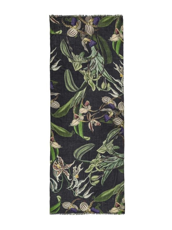The One Hundred Stars Orchid Black Wool Scarf is a long, rectangular accessory that lifts everyday outfits with a printed floral design and softly fringed hems. Woven in wool for an airy drape, it layers easily over coats and knitwear and can be styled as a wrap or worn loose for extra warmth. The botanical pattern offers a subtle decorative touch while the lightweight construction ensures comfortable all-day wear.