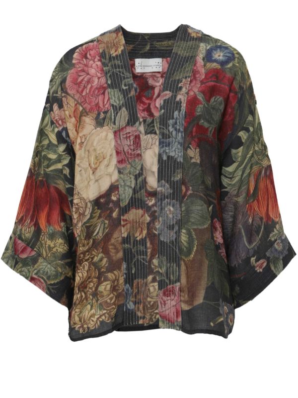 The Primula Black Wool Kimono from One Hundred Stars is a relaxed, open-front layering piece drawing on traditional kimono proportions. It features wide three-quarter sleeves, a boxy cut and stitched front panels that add linear definition. A dense floral print covers the panels and sleeves, while turn-back cuffs provide subtle shaping. Lightweight and easy to layer, this jacket is designed to sit comfortably over separates for a considered, layered look.