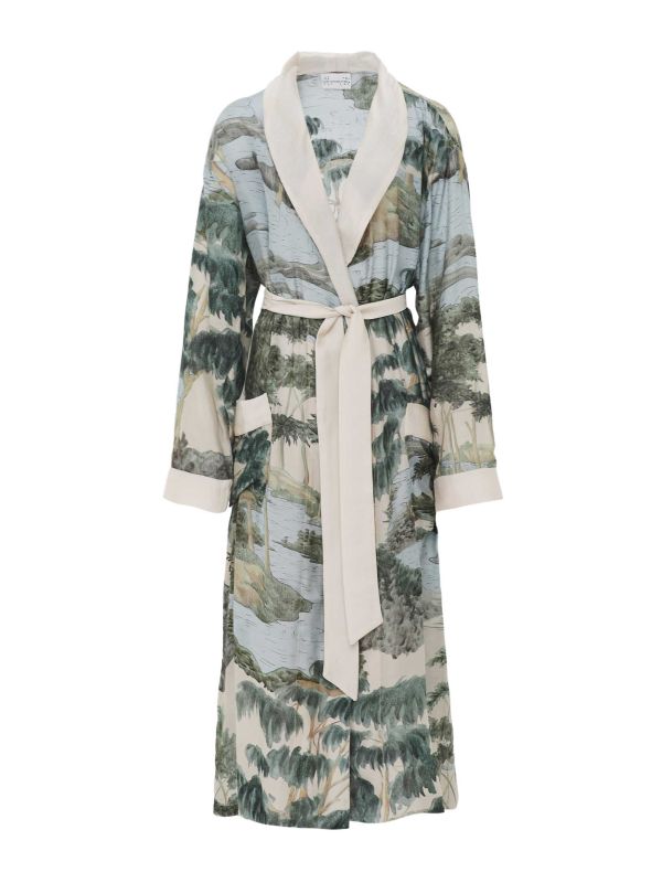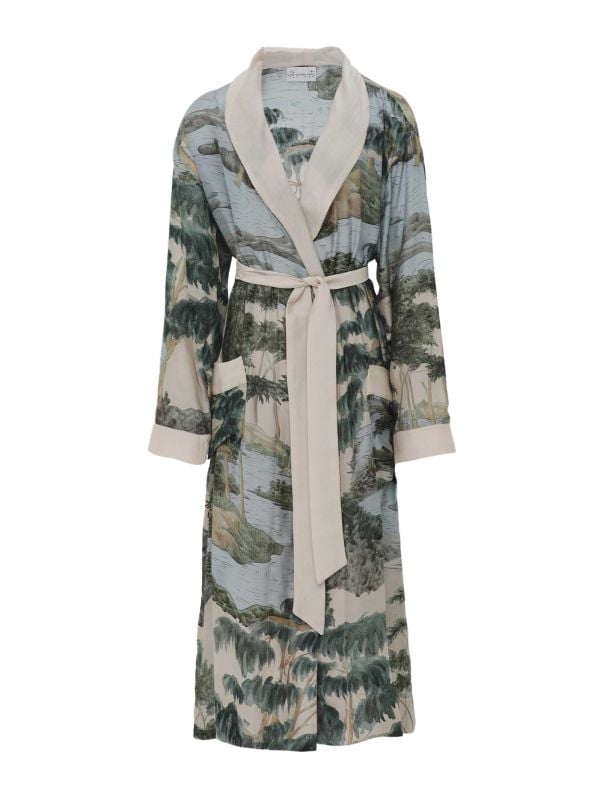 Designed in a versatile one-size silhouette, the One Hundred Stars gown features refined shawl lapels, a self-tie waist belt for a flattering fit, and handy patch pockets for everyday ease. The flowing long sleeves and tranquil Rivers and Trees print evoke a serene, nature-inspired charm—perfect for layering or luxurious lounging.