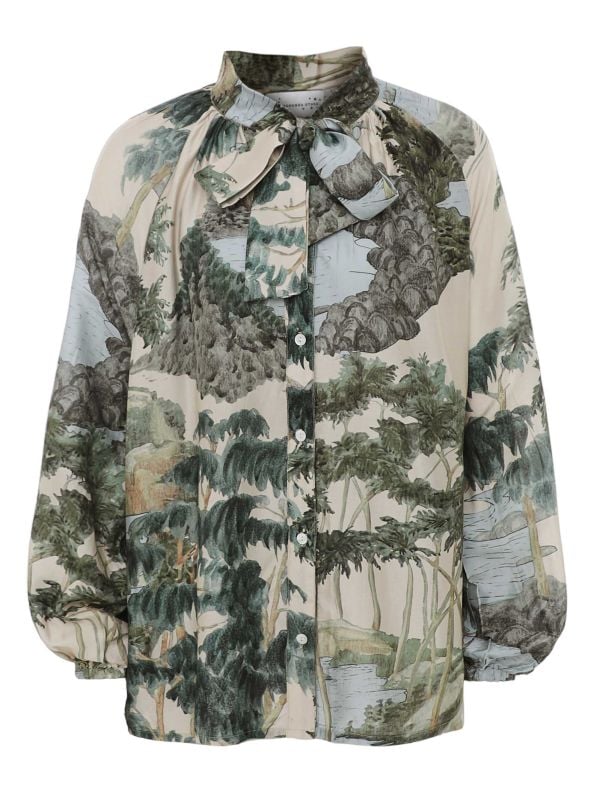 The One Hundred Stars blouse features a softly gathered neckline with a statement pussy bow, while the bracelet-length sleeves are gently gathered for a relaxed yet polished silhouette. Finished with shimmering mother-of-pearl buttons and adorned in the serene Rivers and Trees print, it’s a graceful choice for refined dressing.