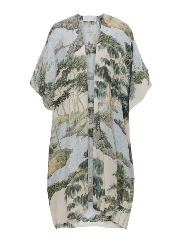 Featuring an open front and relaxed 3/4 sleeves, the One Hundred Stars throwover is ideal for layering over everything from summer dresses to simple tees. Finished in the serene Rivers and Trees print, this one-size piece blends nature-inspired style with laid-back sophistication.