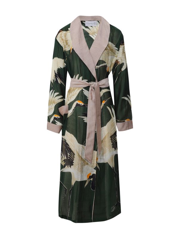 The One Hundred Stars Stork gown is the ultimate in chic home attire. Crafted from a cupro-modal blend, the gown is full length and covered in a pretty stork print with a contrasting collar, cuffs and self-tie waist belt. This art deco-inspired gown can be worn as a stylish night gown when relaxing at home or as a beautiful layering piece over evening outfits.