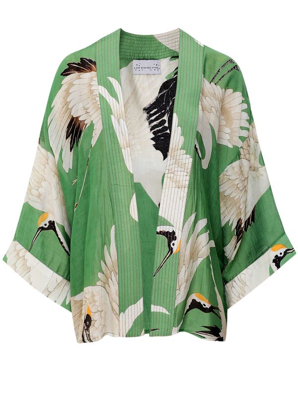 A best-selling design from One Hundred Stars, the Stork Pea Green Kimono is an elegant kimono. Inspired by the art deco movement, this kimono features a pretty stork print, wide 3/4 length sleeves, an open front and embroidered lapel. Suitable for both luxury lounging at home and styling as an evening piece with a sleek dress or pair of trousers.