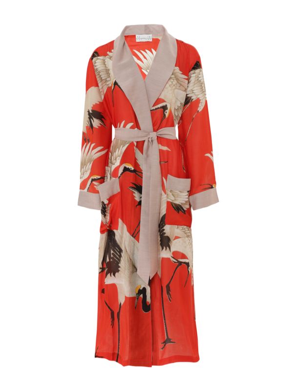 The Stork Print Gown by One Hundred Stars is a long, open-front house gown patterned with an all-over stork motif. It features a shawl collar, long sleeves and a self-tie waist belt to adjust the fit. Two roomy patch pockets provide practical storage while contrast trim defines the collar, cuffs and pockets. Cut to a full length, this gown can be worn as a house coat or layered over nightwear for additional coverage and style.