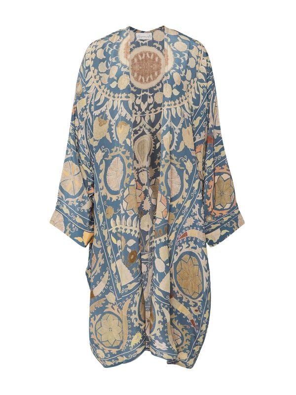 Transform your look with the stunning Susani Blue Grande Kimono by One Hundred Stars. A traditional style kimono, it showcases an oversized pattern inspired by original Susani needlework throws, bringing vibrancy and intricate detail to your collection. This One Hundred Stars kimono is a full-length style with an open front, traditional loose sleeves and concealed side pockets. Wear yours over a top and jeans or layer it over a dress.