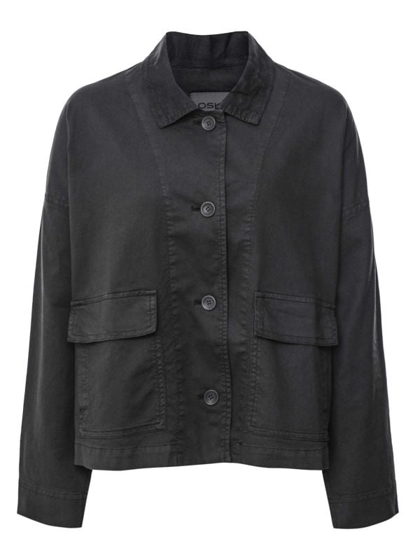 The Boxy Button-Front 518/3383 Jacket is a relaxed jacket from OSKA. Cut for an easy, boxy silhouette, it features a shirt collar, a button-through front and large flap patch pockets for practical styling. The cotton-elastane blend ensures a comfortable fit with a little give, while long sleeves and a straight hem maintain clean lines. Wear over lightweight knits or shirts as a lightweight outer layer. Subtle topstitching and functional pockets give the piece a utilitarian character without excess detailing.