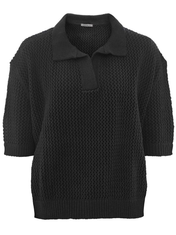 Discover OSKA's 511 Sweater, a stylish buy for your warm-weather wardrobe. This OSKA sweater is knitted from cotton with a pretty mesh stitch, making it a cool and breezy choice. It features a narrow collar and V neckline with a polo placket, finished with dropped shoulders and loose-fit sleeves that pass the elbow. It has an oversized, boxy fit and is ideal for layering over a cami.