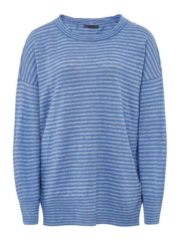 Made from pure linen, the OSKA 520 Sweater is lightweight and soft. An everyday essential, this casual OSKA sweater features a round neckline, long sleeves, colour-coordinated narrow stripes and ribbed trims. It's cut for a loose, straight fit, easy for styling with everything from blue jeans to culottes.