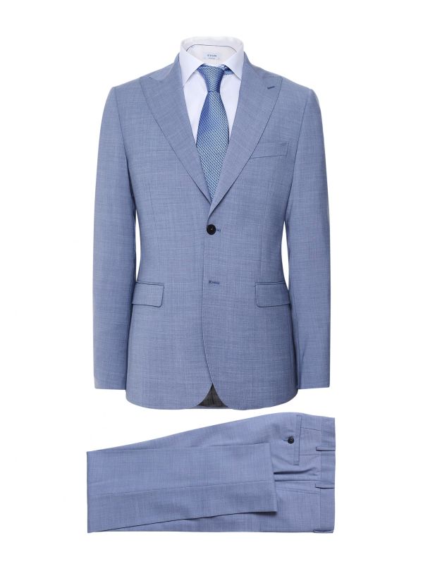 The Pal Zileri wool blend suit is a perfect example of fresh summer tailoring. Lovingly crafted in a wool blend cloth with stretch, the two piece suit offers a sumptuously soft handle and exceptional freedom of movement. Comprising of a single breasted jacket with two button fastening, peak lapels, double vent and stacked button cuffs, whilst the matching pants feature a zip fly, four pocket design and belt loops. The Pal Zileri suit is finished in a pastel blue hue giving it a charming character perfect for formal summer occasions.