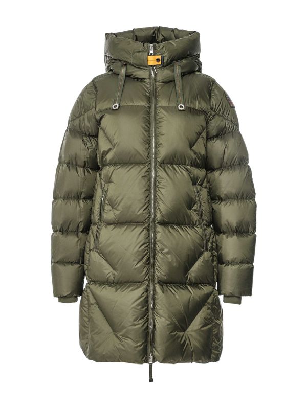 Parajumper's Janet jacket is a long hooded coat filled with down, offering warmth throughout the cold season. It features a high neckline with an adjustable drawstring hood, a two-way zip closure and the distintive yellow tape on the neck closure. This Parajumpers jacket is water-repellent and windproof, offering the perfect everyday coat on winter days.