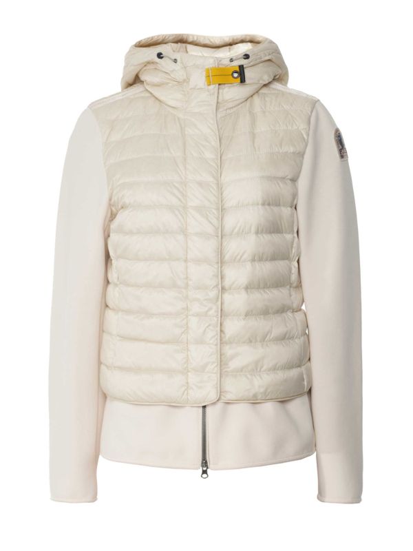 The Parajumpers Lorita jacket is a hybrid style that combines stretch knit with a semi-shine nylon taffeta filled with duck down. A hooded design, it features a two-way zip closure concealed by a button-up flap, finished with the label's signature yellow tape on the neck closure and branded sleeve patch. With it's sweatshirt/coat design, this Parajumpers jacket is a versatile piece you can wear indoors and out.