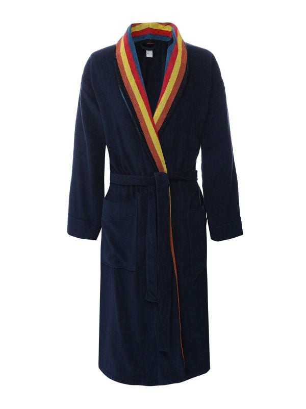 The bold Artist Stripe lapels add a signature Paul Smith touch, bringing a pop of colour to your downtime. Finished with practical patch pockets and a classic waist belt for a snug, adjustable fit, this Paul Smith gown is a must-have for anyone who likes their loungewear with a bit of flair.