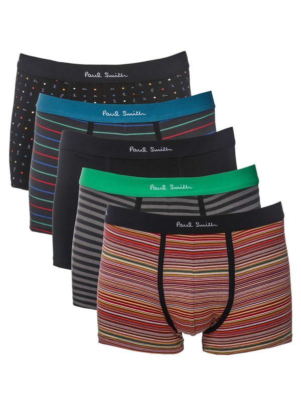 The Paul Smith boxer briefs five pack offers a premium blend of comfort and style, crafted from organic cotton with added stretch for a perfect fit. This set includes five pairs, featuring one plain design and four uniquely patterned styles, ensuring a variety for every day of the week. Each pair is finished with branded waistbands, adding a touch of designer flair. Presented in a branded gift box, this underwear pack makes for an ideal gift or a stylish addition to any wardrobe.