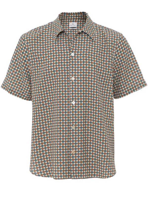 The Paul Smith Casual Fit Geometric Shirt is cut in a relaxed casual fit with a pointed collar and button-through front. The piece features an all-over micro geometric print for a contemporary look, finished with short sleeves for warm-weather wear. It suits smart-casual styling, whether worn alone or layered under a lightweight jacket. Made from a lyocell and cotton blend, it offers a soft, breathable handle for day-long comfort and easy wearing in the seasons ahead.