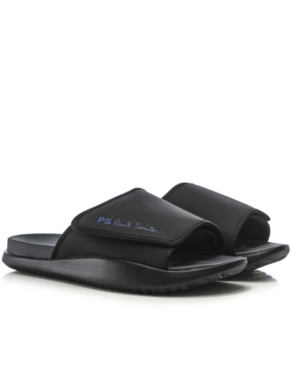 The Paul Smith Chiba Adjustable Slides are designed with a wide hook-and-loop strap bearing the PS Paul Smith signature. A contoured, cushioned footbed delivers support while the moulded sole and patterned rubber tread provide reliable grip and durability. The padded strap and open-toe construction make them easy to wear, whether at home or on short trips. Lightweight and practical, these slides combine comfortable performance with subtle Paul Smith detailing for a considered finish.