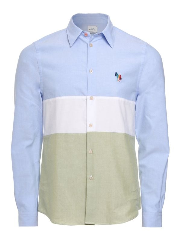 The Paul Smith colour block shirt exudes the label's penchant for bold design. Crafted in organic cotton, the shirt has been cut to a tailored fit for a contoured silhouette. Featuring a pointed with buttoned cuffs and colour block panels, whilst the famous Zebra lends signature detail.