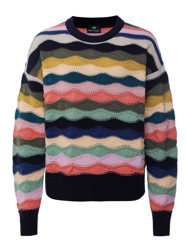 Stand out in the vibrant Crew Neck Knitted Jumper by Paul Smith. Crafted from a cotton-wool blend, this Paul Smith jumper boasts a colourful knit pattern of wavy stripes, finished with ribbed trims. It has a crew neck and long sleeves, perfect for the colder seasons.