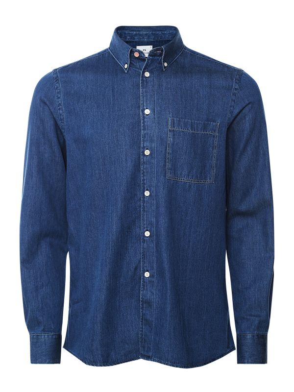 Update your casual weekend wear with the Paul Smith denim shirt. Cut to a regular fit, the shirt has been crafted in premium cotton denim. Featuring a button down collar, chest patch pocket and buttoned cuffs, with the label's signature top pink button adding signature detail.