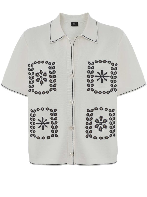 Paul Smith presents the Floral Embroidery Short-Sleeve Shirt, a button-through knitted piece detailed with embroidered geometric motifs and contrast piped trims. It features a point collar, short sleeves and a front button fastening for a neat finish. It's made from 100% cotton, offering breathable structure ideal for layering over camisoles or pairing with tailored Pants. Ribbed edges at the placket and hem complete the design, giving subtle definition to the silhouette. Wear it with high-waisted denim or under a lightweight blazer for transitional dressing.