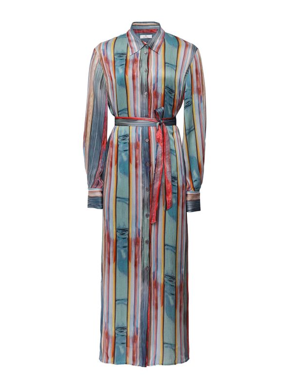 The Paul Smith 'Glass Stripe' midi dress is an elegant shirt dress with a bold seasonal stripe pattern, long sleeves and shell buttons. This transitional dress features a self-tie waist belt for a flattering fit and is a must to team with sneakers on summer days.